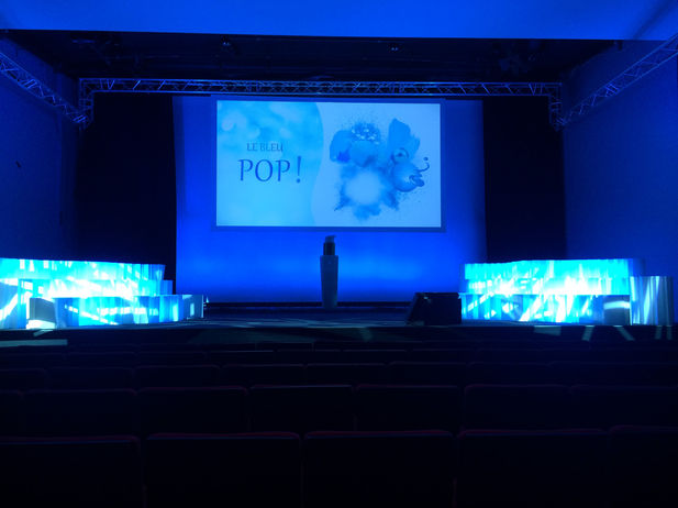 - scénique: aménagement d'une décoration scénique tout en courbe, en procédé Chesnel, reprenant la couleur des produits & show de reveal du produit en 3D sur scène!